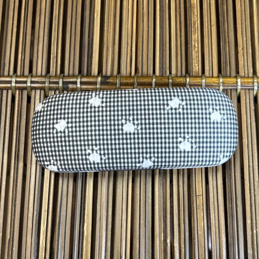 猫がデジタルプリントされた布が周りに貼られている商品です。メガネケースの外側の柄と同じ眼鏡拭き付きです。