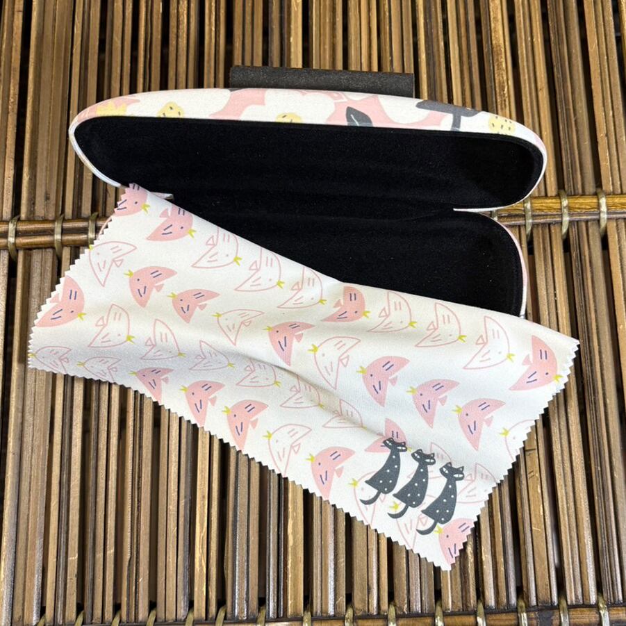猫がデジタルプリントされた布が周りに貼られている商品です。メガネケースの外側の柄と同じ眼鏡拭き付きです。